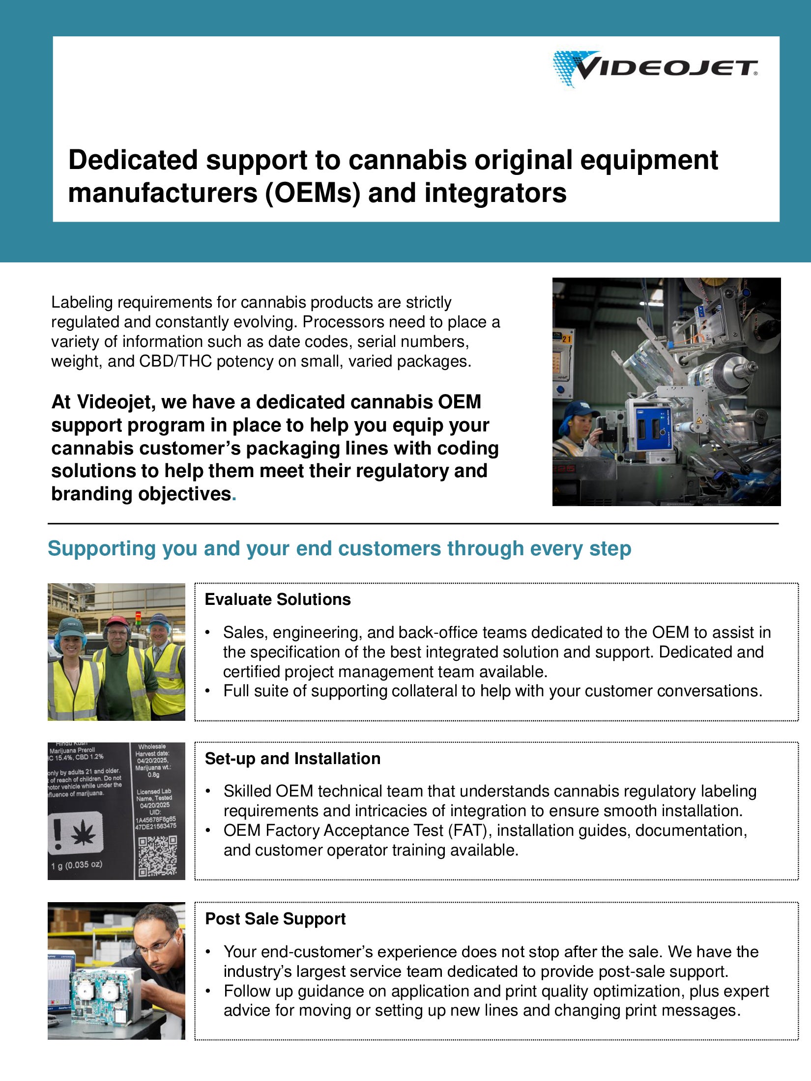 We partner closely with major cannabis packaging equipment providers (or original equipment manufacturers i.e., OEMs) to delivery turnkey solutions to the cannabis industry. Videojet has an industry leading dedicated OEM specific technical team that supports the needs of equipment manufacturers and integrators. This dedicated team provides support for Videojet coding solutions – including and not limited to – equipment evaluation, installation assistance and prioritization along with full implementation of after sales support for the OEM’s cannabis end customer.