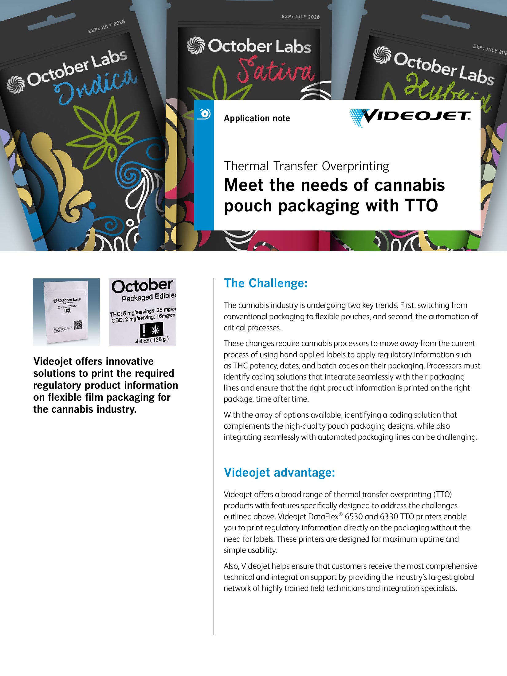 Labeling requirements for cannabis products are strictly regulated and constantly evolving. Processors and packagers of cannabis products are challenged to place vital product information on small, varied packaging surfaces. The wide range of required information such as date codes, batch numbers, serial numbers, weight, strain, testing lab and cannabinoid content poses an additional challenge to processors and packagers.