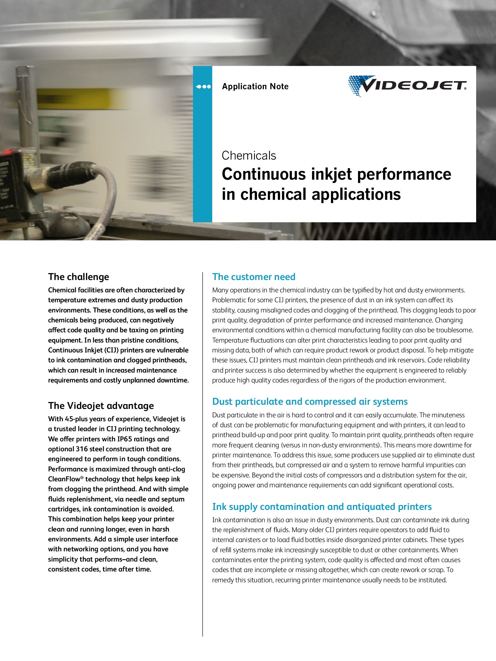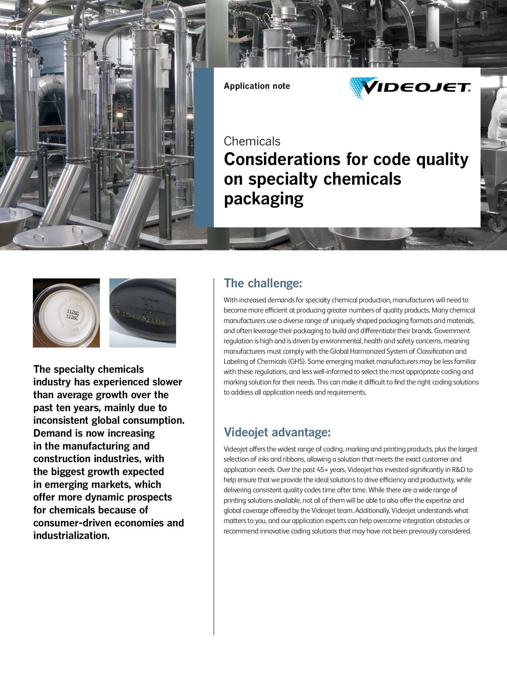 Coding in chemical manufacturing can be challenging due to harsh production environments that can be hot, dusty or wet. To achieve reliable, high quality codes, your coding equipment should be engineered to withstand these challenges as well as near-constant production and frequent changeovers. From addressing internal quality control needs to meeting your customer’s traceability requirements, Videojet can help.