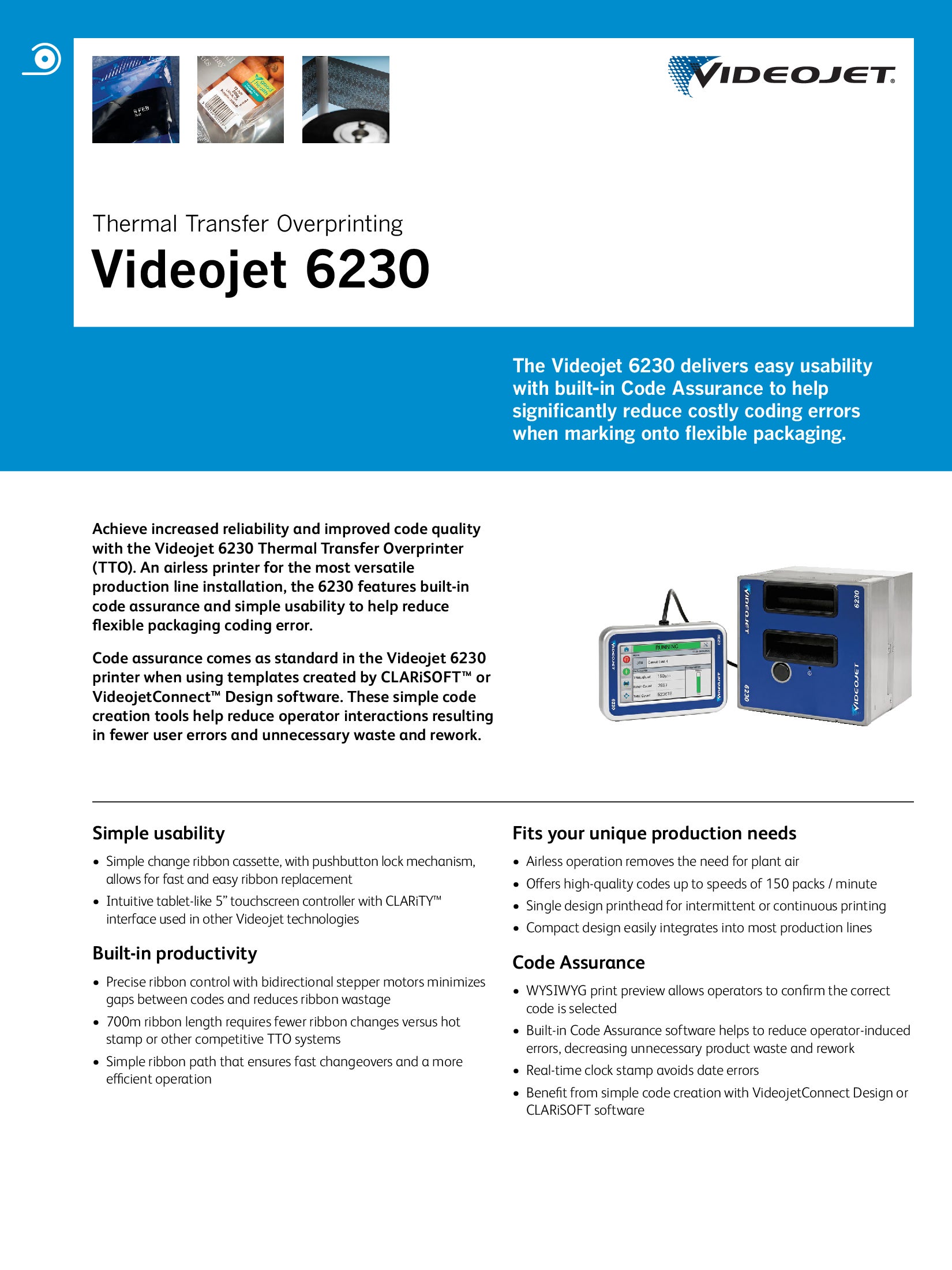 The Videojet 6230 is a low speed Thermal Transfer Printer that utilizes the latest technology to help reduce flexible packaging coding errors, and improve total cost of ownership (TCO) through a proven and cost-effective solution.