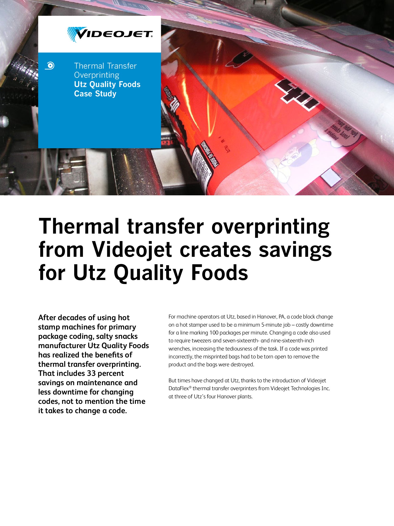 Changing codes when using an old hot stamp machines required costly downtime on an Utz Quality Foods line running 100 packages a minute. Videojet showed Utz the benefits of thermal transfer overprinting including savings on maintenance and less downtime for changing codes. Code changes now require just a few taps of a touch screen. Downtime for code changes has virtually disappeared with Videojet thermal transfer overprinters. Learn more….